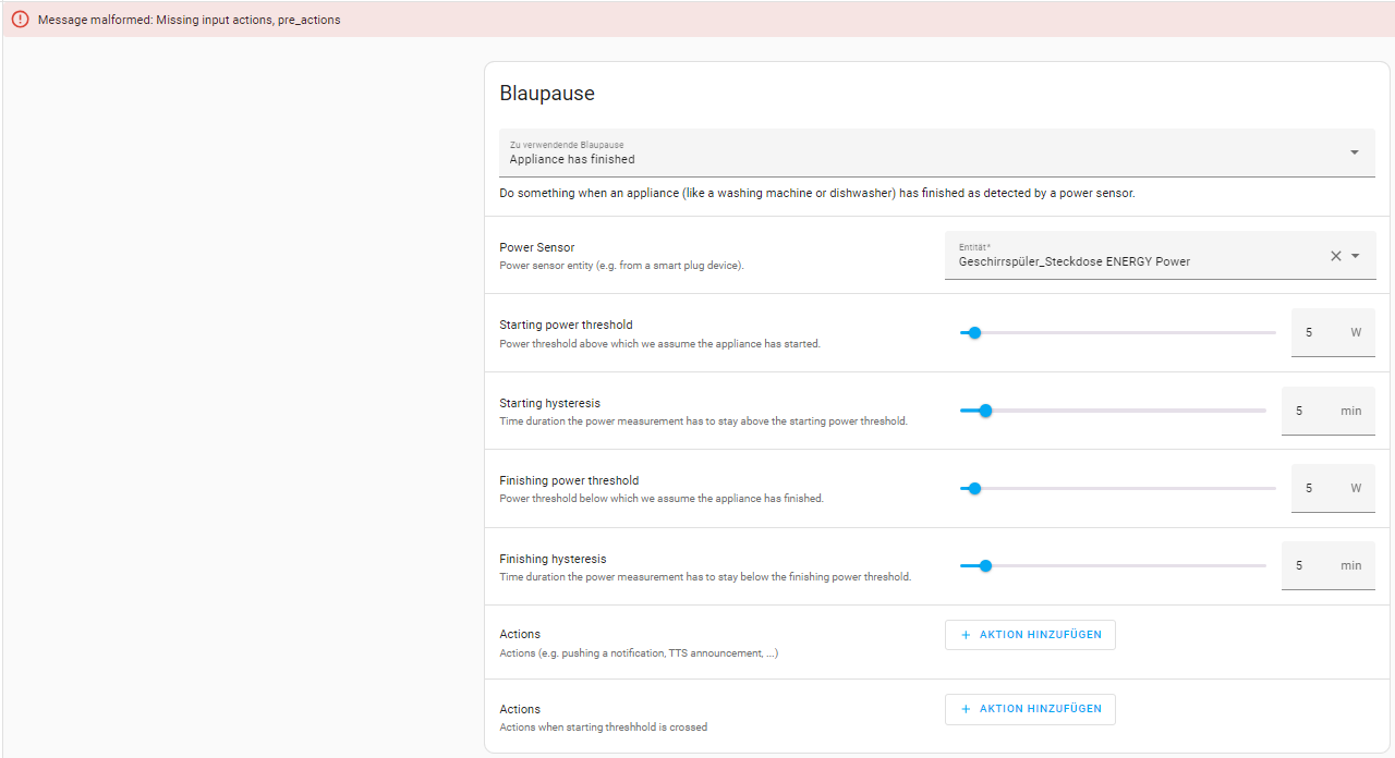 Fehler ist immer Message malformed: Missing input actions, pre_actions