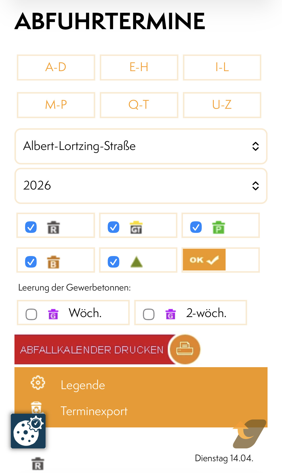 Bei unserem „persönlichen Abfuhrkalender“ können Sie auswählen, welche Tonnen und Abfuhrtermine Sie angezeigt und ausgedruckt bekommen möchten. Für alle, die digitale Kalender nutzen, wird eine Exportfunktion angeboten. Auch Gewerbebetriebe können...