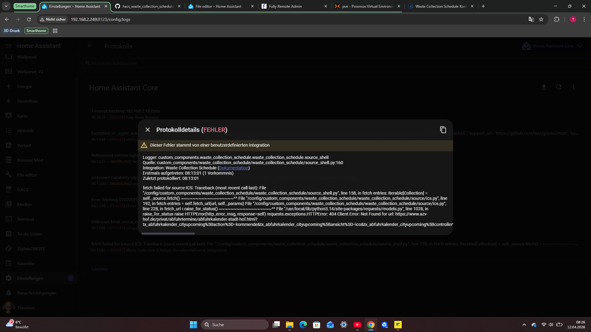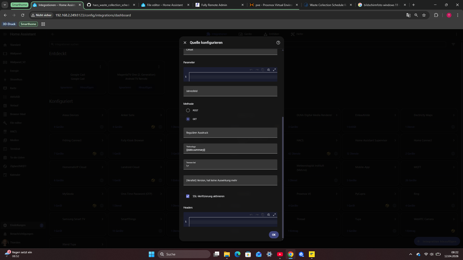 ich versuche seit Tagen die Waste Collection Integration zum laufen zu bringen.