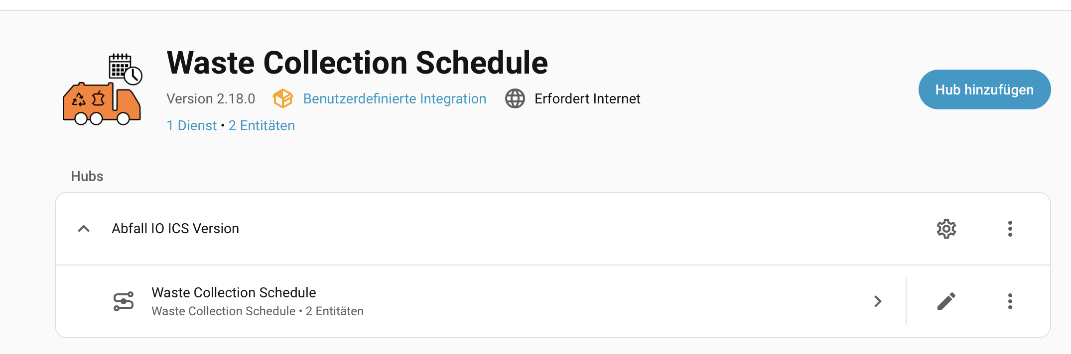 Einstellungen → Geräte → Waste Collection… (Version 2.18)-> Hub hinzufügen