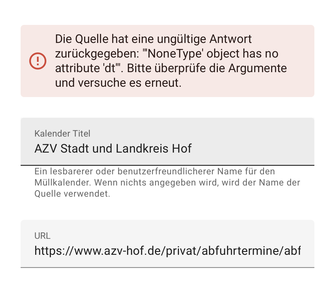 Meine Müllentsorgung läuft über den azv Hof. Ich habe schon sämtliche Anleitungen und Videos die ich im Netz gefunden habe probiert, aber nix hilft. Über die Benutzeroberfläche komme ich nur bis zur Eingabe der url. Es kommt kein Fehler aber ich komm nicht weiter. Die Konfiguration über die configuration.yaml erzeugt mir meinen Kalender, aber es kommen keine Werte.