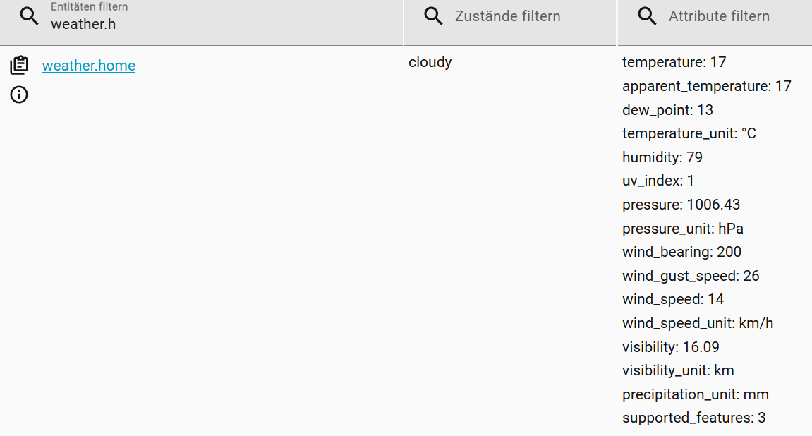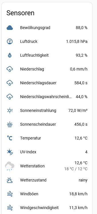 Hierzu habe ich mir die Integration vom DWD installiert. Hierbei ist mir nur aufgefallen, dass es keine direkten Entitäten zu Vorhersagen gibt.