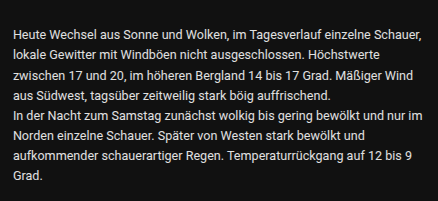Ich hatte mir für die DWD-Integration aus HACS, die auch die Entität für den Wetterbericht zur Verfügung stellt, also zum Beispiel sensor.duisburg_baerl_wetterbericht, je nach ausgesuchter Wetterstation, eine Markdown Karte gebastelt / zusammengeklaut, mit der das einigermaßen gut funktioniert, kannst du ja vielleicht testen: