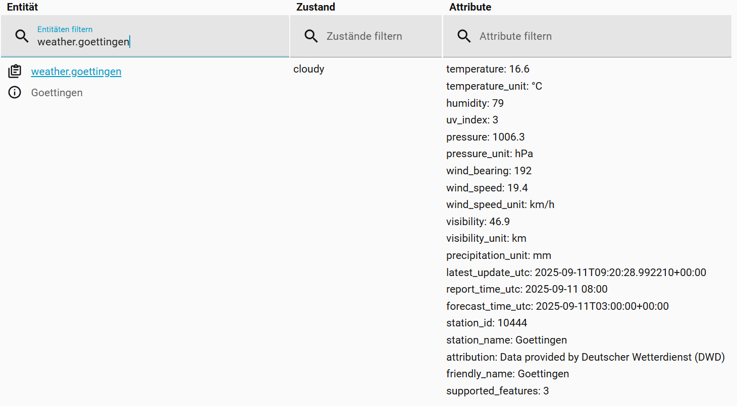 Vorher musst du nur die entsprechende Entität bei deiner Wetterstation in der DWD Integration aktivieren und in den Code oben anstelle von Duisburg-Baerl eingeben. Sieht bei mir dann im Moment so aus:
