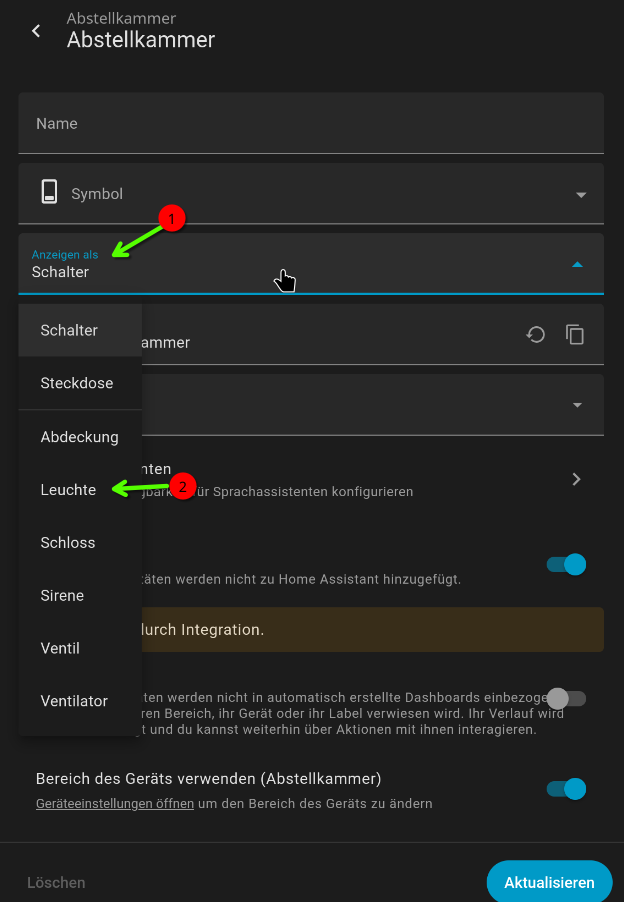 ich habe TASMOTA Steckdosen integriert und möchte denen den Gerätetype-Schalter zu weisen.