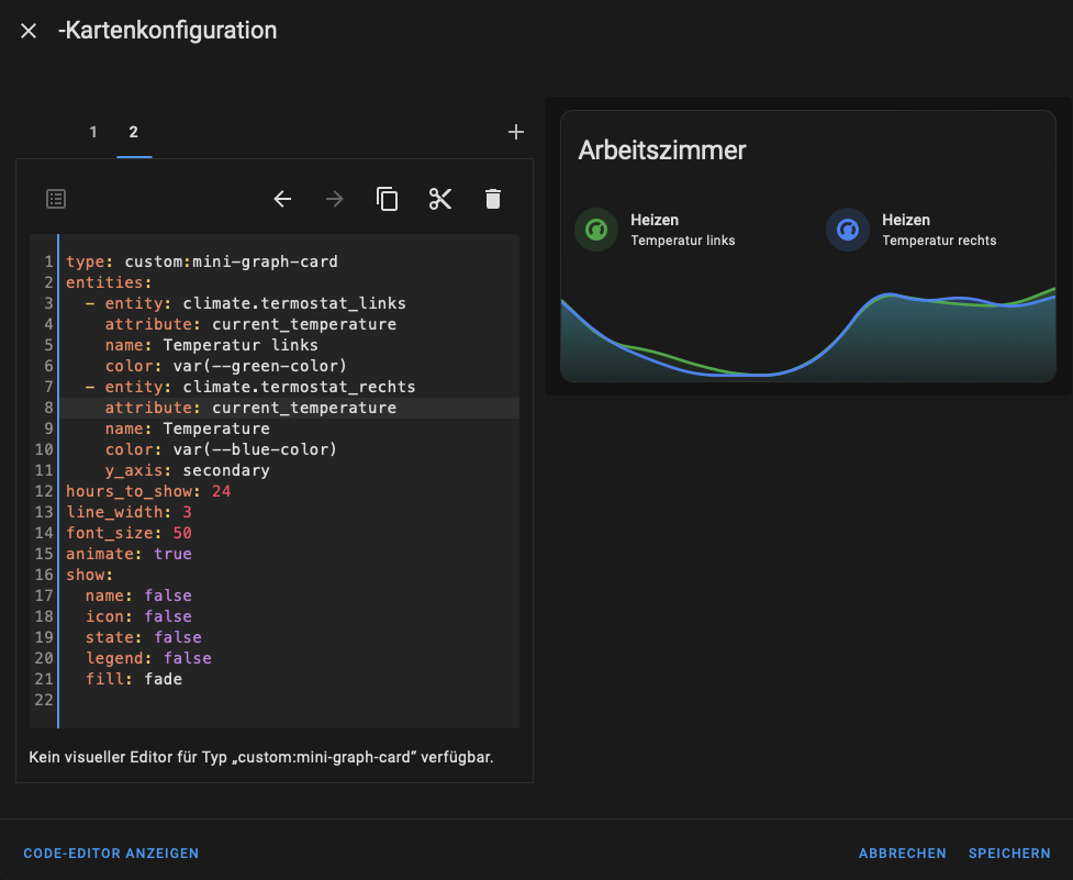 Wenn du das Template erstellt hast, heißt das - wenn du nach meinem Beispiel gehst - sensor.schlafzimmer_temperatur . Du hast ja mit dem Template quasi einen neuen Sensor erstellt, dessen Wert du nun auslesen und darstellen möchtest. Also die entity ändern.