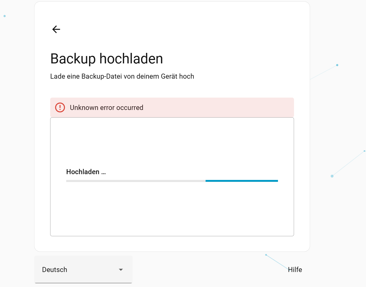 Ich versuche die ganze Zeit zumindest das letzte Backup vom 29.01, 28.01 oder 27.01 aufzuspielen. Sogar das hochladen bricht er immer ab. Einmal hat es geklappt. Ich habe auf Wiederherstellen gedrückt, den Code mit “-” kopiert eingegeben und gewartet. Nach Neustart war kein Backup aufgespielt, alles wie vorher, also Grundkonfiguration.