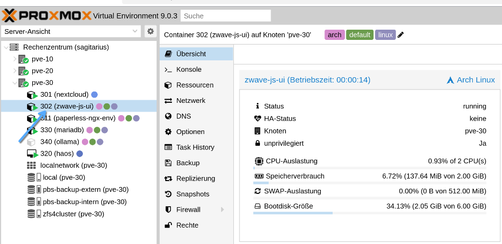 Ich bin aber von Z-Wave weg, hin zu Z-Wave JS UI, persönlich finde ich die hübscher, moderner, als Z-Wave, zudem habe ich dann, wenn ich noch kein Docker einsetze, eine weitere Schicht, die ich pflegen muss, beim LXC mit Z-Wave JS UI fällt der Docker weg.