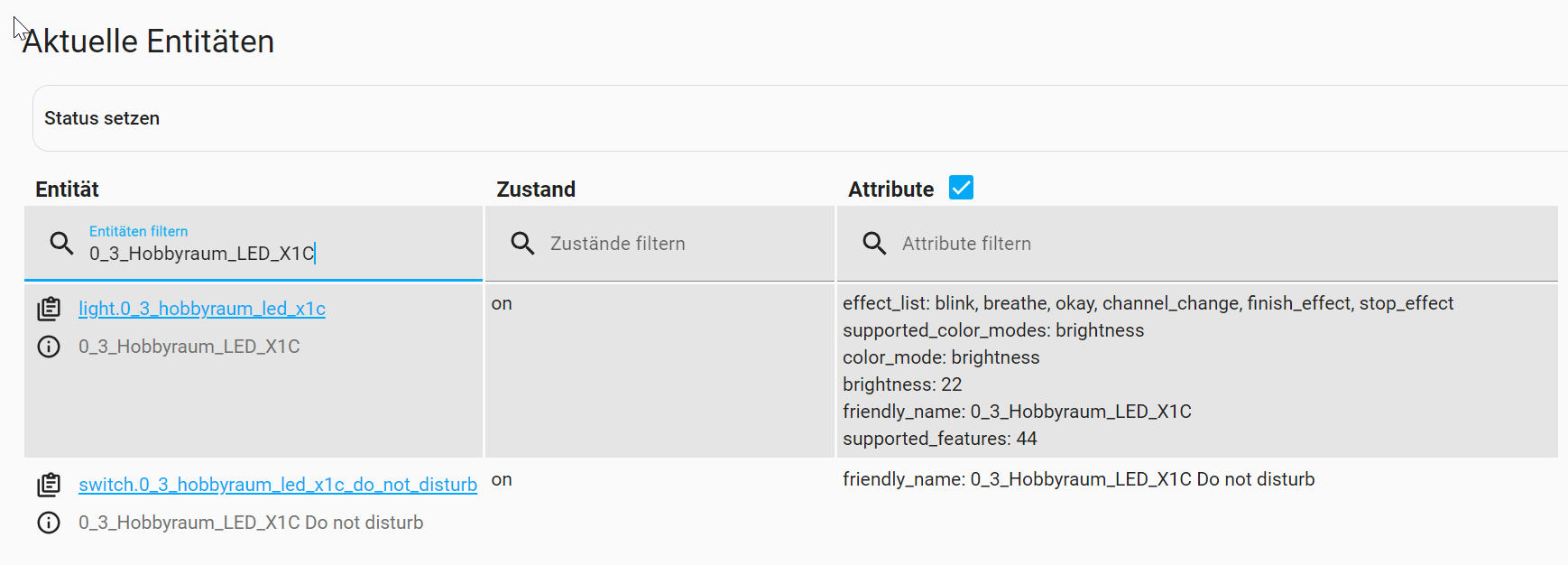 Kannst du mal einen Screenshot von dem Gerät unter Entwicklerwerkzeuge - Zustände machen? Gibt es evtl. mehrere Entitäten zu diesem Gerät?