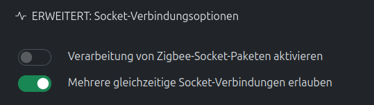 Also Stromausfall um 01:00 und bis 06:00 oder 07:00 hat sich nix erhohlt. Bei mir war sowohl “Verarbeitung von Zigbee-Socket-Paketen aktivieren” als auch “Mehrere gleichzeitige Socket-Verbindungen erlauben” angehakt. Habe jetzt testweise mal die Option bei “Verarbeitung von Zigbee-Socket-Paketen aktivieren” entfernt. Verstehe sowieso nicht, was die bringen soll.