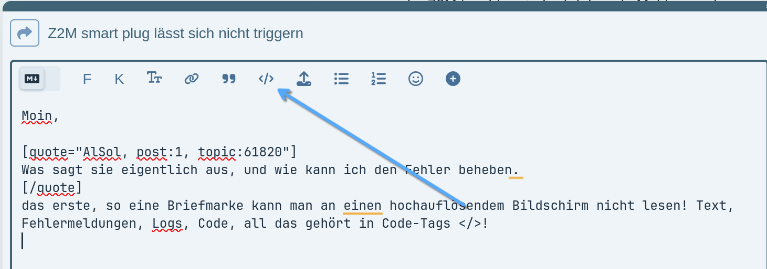 das erste, so eine Briefmarke kann man an einen hochauflösendem Bildschirm nicht lesen! Text, Fehlermeldungen, Logs, Code, all das gehört in Code-Tags </>!