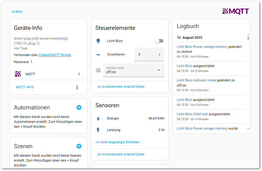 Wenn Du Dir das Netzwerk in Z2M anschaust, sollte dieser Zwischenstecker jetzt ohne Verbindung dastehen, ist aber auch nur eine Vermutung.