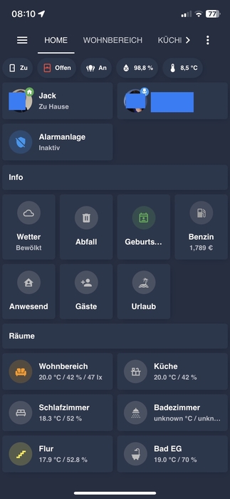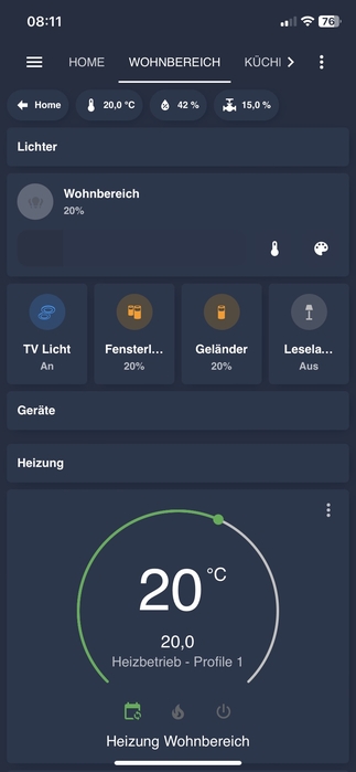 An der erste Seite habe ich noch zusätzlich „Action“ Buttons eingebunden (z.b. Gast) damit werden die Automation beeinflusst bzw. an und / oder ausgemacht je nach Situation.