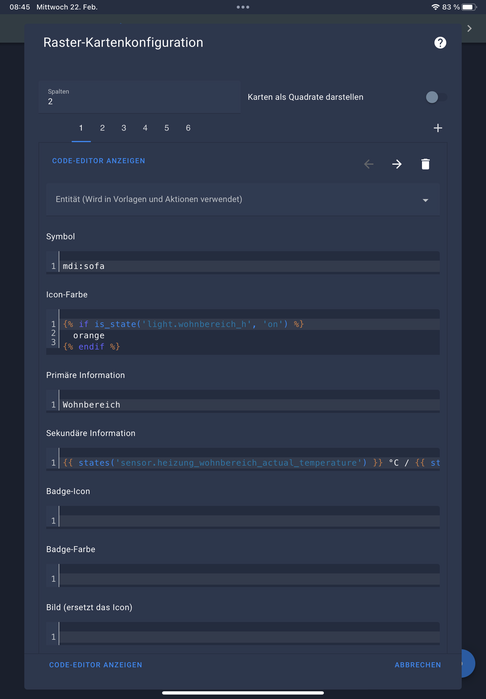Hat alles geklappt! Danke Jungs. Ich habe noch ein Anliegen. Ich habe dir RGB Lampen von Smart Lifte 24 und ich möchte jetzt gerne einen Button in mein Dashboard haben wo die Lampen grün werden bzw. 2Grün und 2Blau. Wie kann ich das umsetzten?