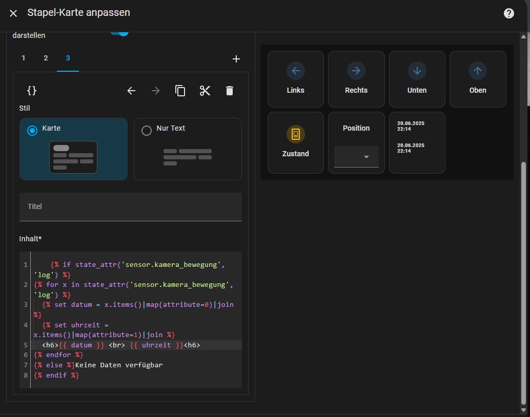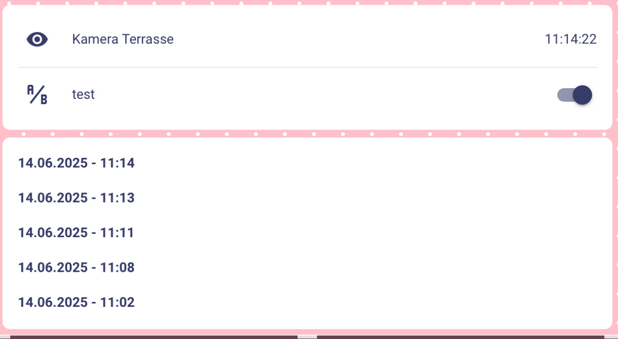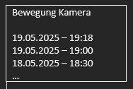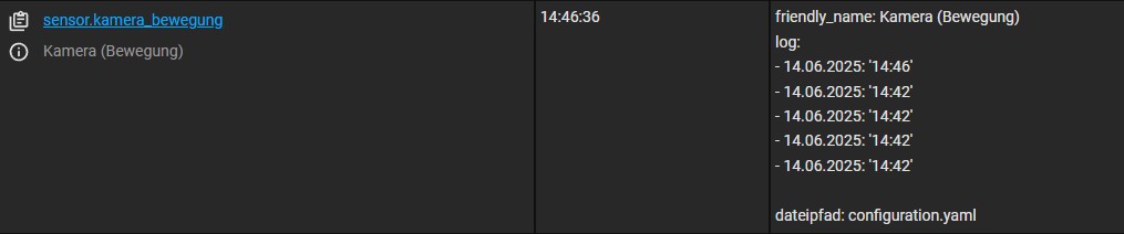 Ich habe mit eine Tapo Cam TC71 zugelegt (dazu nur soviel: SUPER!). Diese Kamera hat eine Entität, wo diese Bewegungen erkennt und meldet. Ich möchte gerne die letzten n (ca. 3-5) als Element auf dem Dashboard haben, so das ich die letzten n Events (Bewegung erkannt) sofort auf einem Blick erkennen kann. Auch möchte ich NUR die erkannten Bewegungen sehen und nicht den Eintrag “Wurde frei”.