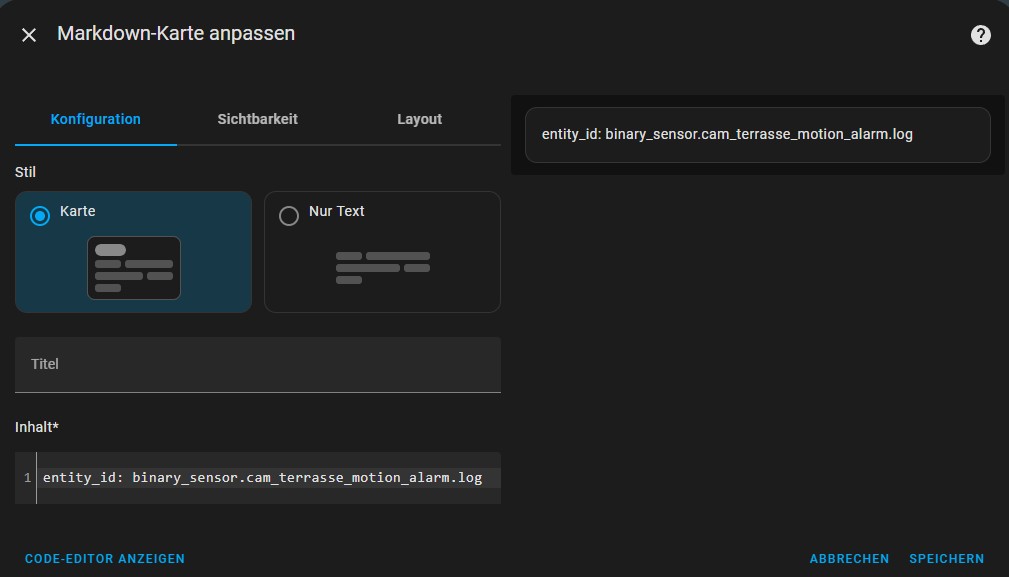 Die Markdown Card akzeptiert keine entity_id. Man muss durch das Attribut log loopen: