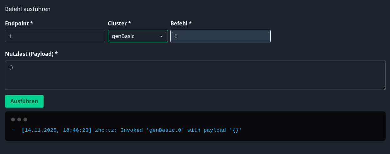 Endpoint und Cluster sind auszuwählen. Im Feld Befehl ist die “0” einzugeben, Nutzlast (Payload) bleibt leer {}