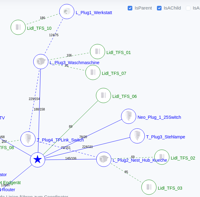 Der Lidl_TFS-01 ist in der Küche wo es ebenfalls Zigbee Plugs als Router gibt, aber trotzdem nutzt er eine Verbindung mit dem Zigbee Plug im HWR.
