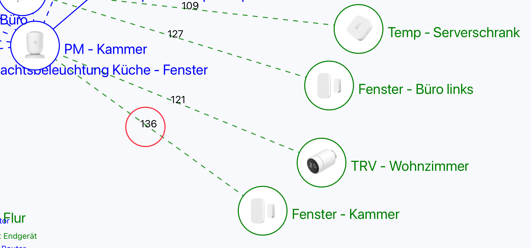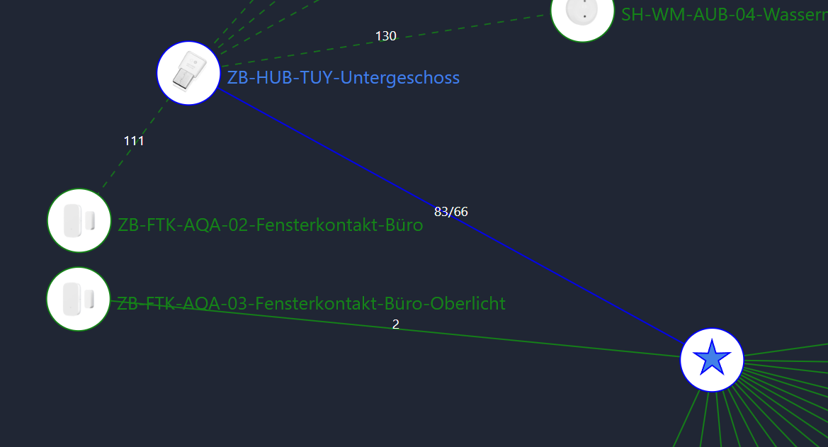 Im Bild sieht man einen Zigbee-HUB im Obergeschoss. Der ist neu und es haben sich dort auch nach einiger Zeit ein paar Gäste eingefunden. Das Gateway, an dem die meisten hängen, ist eine Etage höher. Das Büro, in dem sich das Fenster befindet, ist auch im Untergeschoss. Beide Fensterkontakte sind nicht mal einen haben Meter auseinander.
