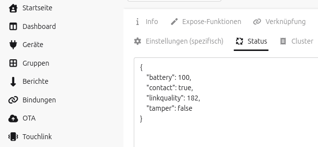 Wenn Du z.B. einen Tür-/Fensterkontakt mal auslöst, solltest Du dies im Z2M WebGUI bei dem Status des Gerätes sehen können. Also z.B. da.