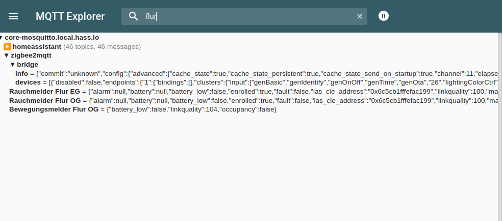 Ich habe mir gerade MQTT Explorer installiert und kann die Geräte dort nich finden, allerdings mit weniger Informationen, als die Geräte, die noch richtig angezeigt werden.