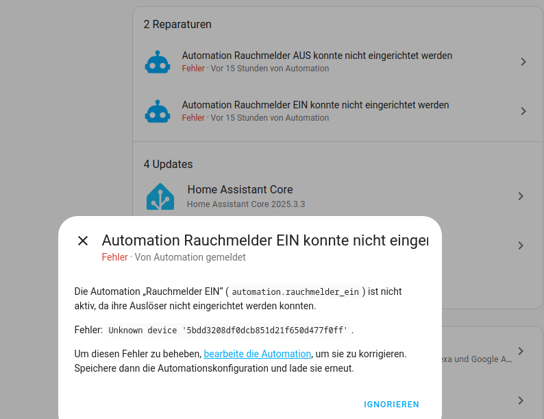 Bemwerkt habe ich das gestern Abend nachdem ich das System neustarten musste wegen einem Problem mit der Lichtautomation, danach erhielt ich diese Meldung, daß eine Automation nicht eingerichtet werden konnte, wegen fehlender Geräte