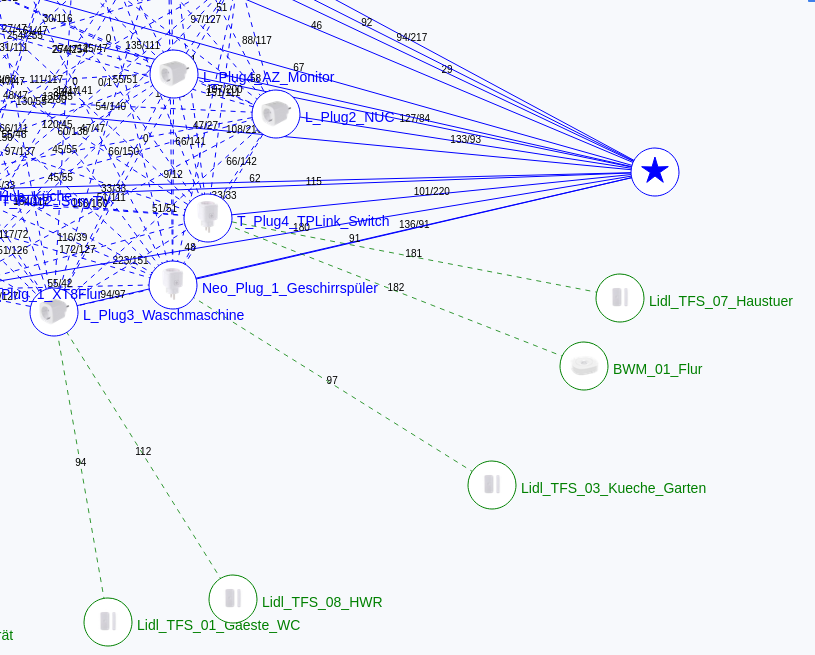 Der blaue Stern ist der Coordinator (hier ein SLZB-06). Die durchgezogenen blauen Linien sind Verbindungen zu einem aktiven Zigbee Gerät das auch als Router arbeitet. Bei mir sind das ausschließlich Zigbee Plugs. Die gestrichelten blauen Linien sind Verbindungen zwischen aktiven Zigbee Geräten die als auch Router arbeiten/fungieren. Die gestrichelten grünen Linien sind Verbindungen zwischen batteriebetriebenen Zigbee Geräten (hier Tür-/Fensterkontakte und ein Bewegungsmelder) und einem aktiven Zigbee Gerät das als Router arbeitet (hier Zigbee Plugs).