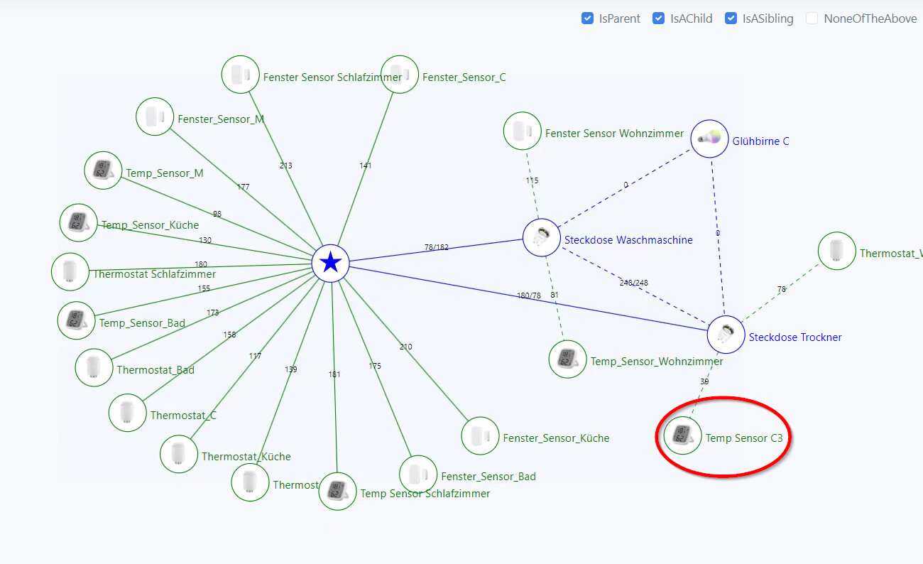 Bei einem Blick auf die Routing Karte ist mir aufgefallen, dass dieser Sensor sich nicht direkt mit dem Sonoff Dongle verbindet, sondern mit einer Nous Steckdose.