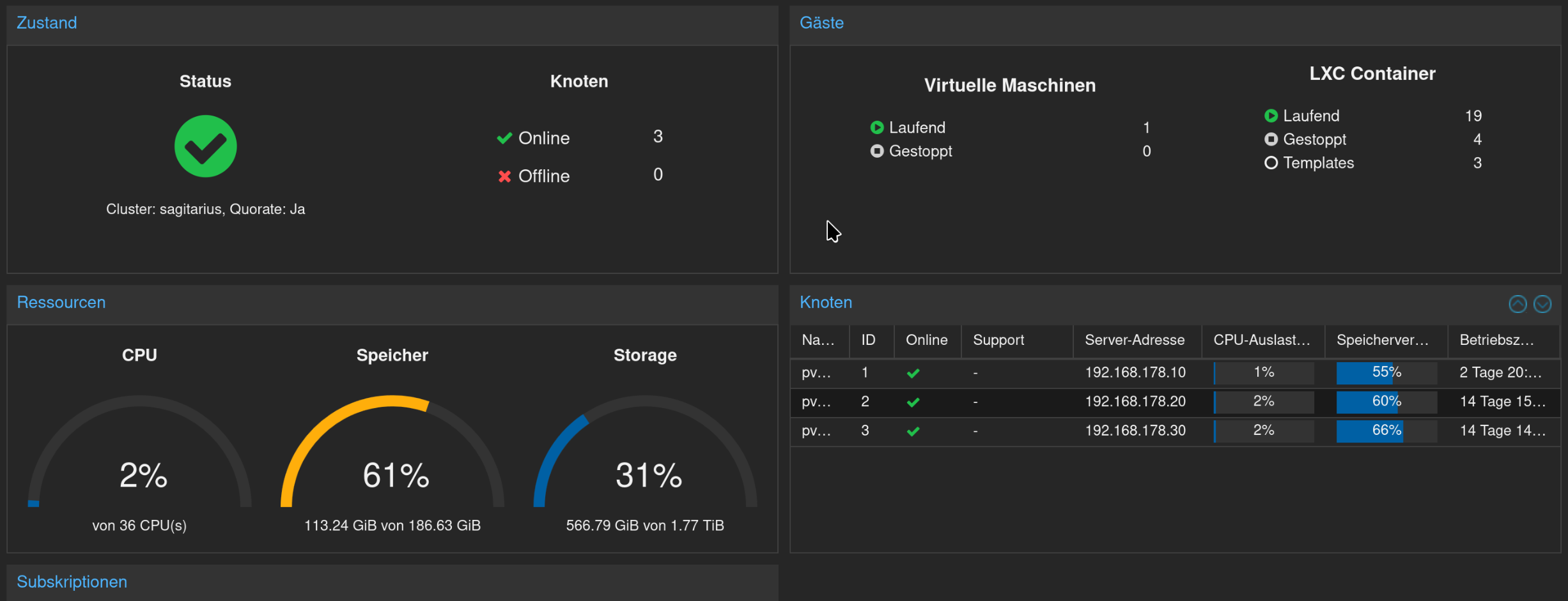 das war der Grund, warum ich von einem single Proxmox zu einem Cluster gewechselt habe, wenn ich jetzt noch die zwei USB-Sticks (Zigbee u. Zwave) gegen LAN Fähige tausche, interessiert mich ein Ausfall von einem, bzw. zwei Knoten nicht, dann läuft alles halt auf einem dritten weiter und viel tun muss ich nicht, denn dann geschieht die automatisch, aktuell muss ich die USB-Sticks umstecken.