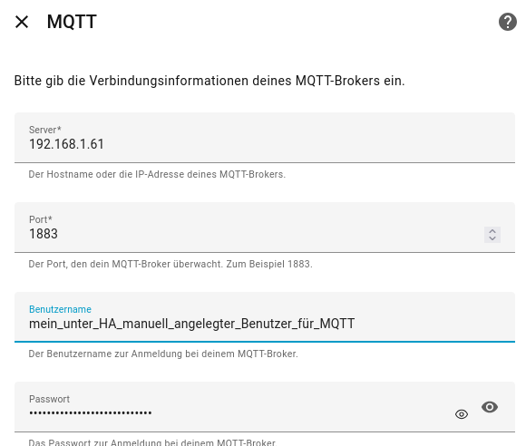 und die Integration holt sich die Daten dann selber und automatisch und bei Integrationen bei denen die MQTT Broker Zugangsdaten dann manuell eingetragen werden müssen, nutzt man dann die MQTT User den man selber noch zusätzlich angelegt hat.