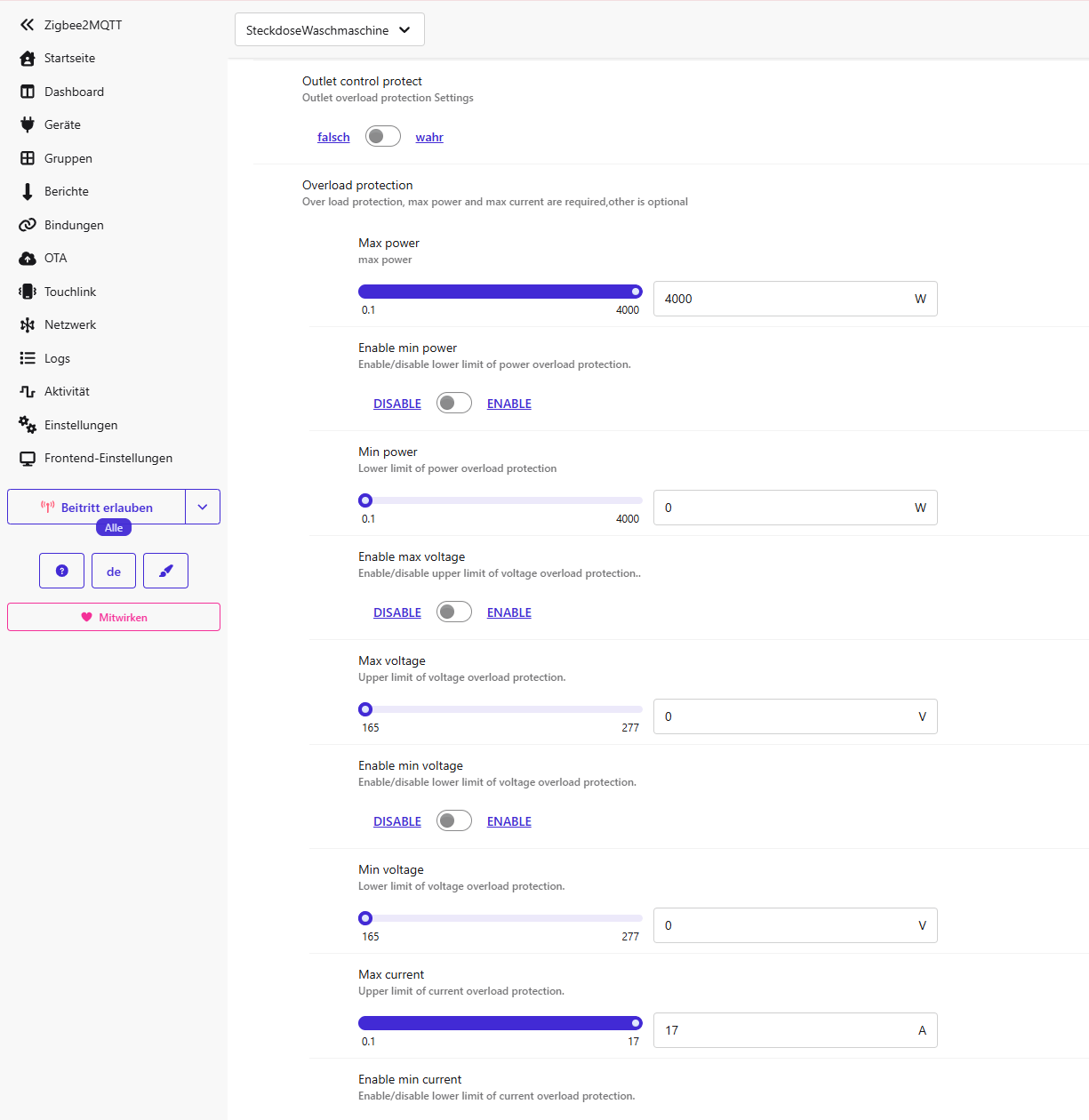 [2026-04-13 19:07:38] info: z2m:mqtt: MQTT publish: topic 'zigbee2mqtt/SteckdoseWaschmaschine', payload '{"current":0,"energy":null,"energy_month":0,"energy_today":0,"energy_yesterday":0,"linkquality":141,"network_indicator":true,"outlet_control_protect":false,"overload_protection":{"enable_max_voltage":"DISABLE","enable_min_current":"DISABLE","enable_min_power":"DISABLE","enable_min_voltage":"DISABLE","max_current":0,"max_power":0,"max_voltage":0,"min_current":0,"min_power":0,"min_voltage":0},"power":0,"power_on_behavior":"previous","state":"ON","update":{"installed_version":8194,"latest_release_notes":null,"latest_source":null,"latest_version":8194,"state":"idle"},"voltage":231.9}'