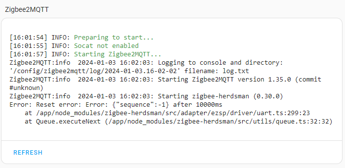 Zigbee2MQTT:error 2024-01-04 11:05:16: Error while starting zigbee-herdsman