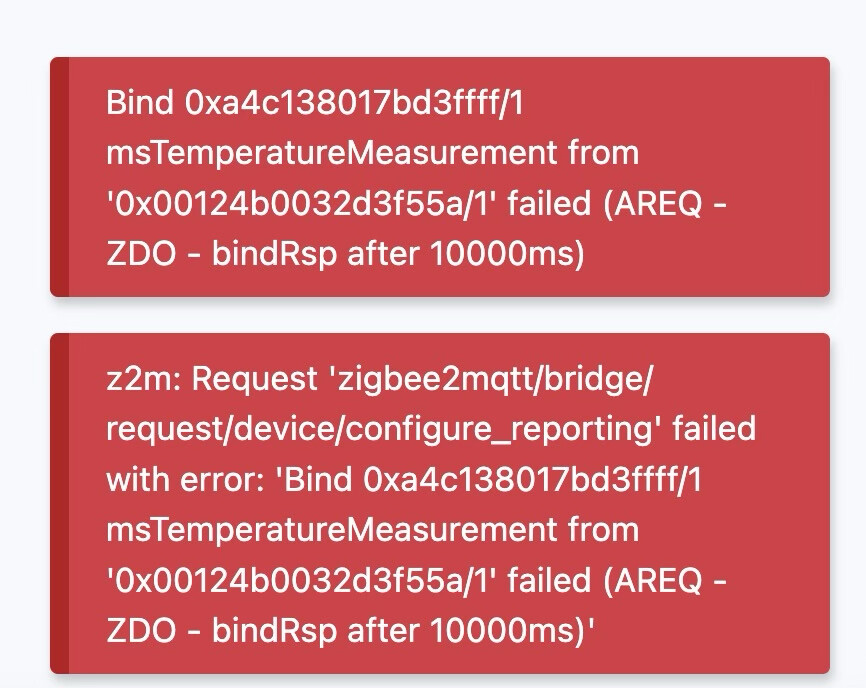 Die Messwerte für Temperatur und Feuchte werden alle 60 Minuten übertragen. Ich finde eine Einstellung bei Zigbee2MQTT für Berichte mit einem maximalen Meldeintervall mit 3600 und denke das könnte es sein. Sobald ich hier einen anderen Wert eingebe, z.B. 600 und ‚Anwenden‘ klicke, kommt folgende Fehlermeldung. Der Wert wird nicht übernommen!