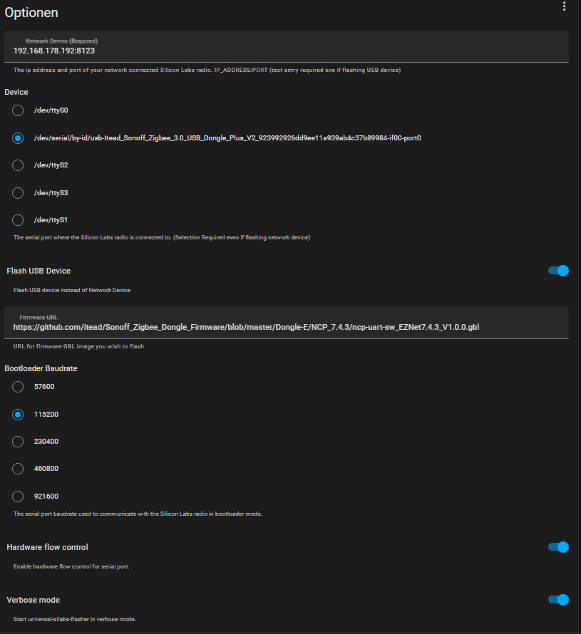 Ja mit der Bezeichnung ezsp oder ember ist das so eine Sache. Wenn man die Firmware nicht aktuell hat könnte es so oder so funktionieren. Was nur wichtig ist, ist das der komplette Pfad vom Stick eingetragen wird, so einfach wie bei dem SkyConnect geht das nicht.